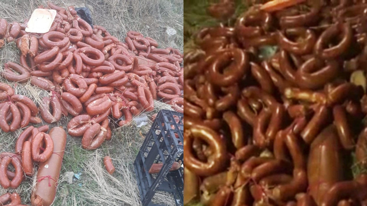 Çok sayıda sucuk, kavurma ve salamın gelişigüzel şekilde atıldığını gören vatandaş, durumu cep telefonuyla kaydederek yetkili kurumlara ihbarda bulundu.