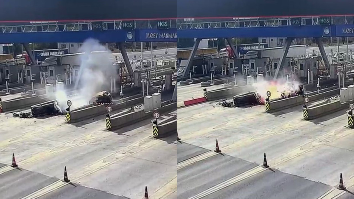 İstanbul Kuzey Marmara Otoyolu gişelerinde bir kişi kiraladığı otomobille beton refüje çarptı. Takla atan araç parçalanarak yandı. Sürücü hayatını kaybederken kaza anı kameraya yansıdı.