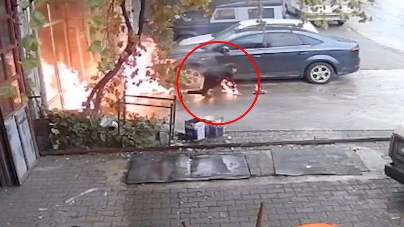 Ekiplerin incelemeleri sürerken, yangın anı saniye saniye güvenlik kamerasına yansıdı. Görüntülerde, iş yerinin içinden bir anda alevler yükselmeye başladığı ve bu sırada içeride bulunan iki kişinin koşarak dışarı çıktığı görülüyor. Son anda dışarı çıkabilen S.S. ve Onur G., koşarak kıyafetlerini ve ellerini saran alevleri söndürmeye çalışıyor.