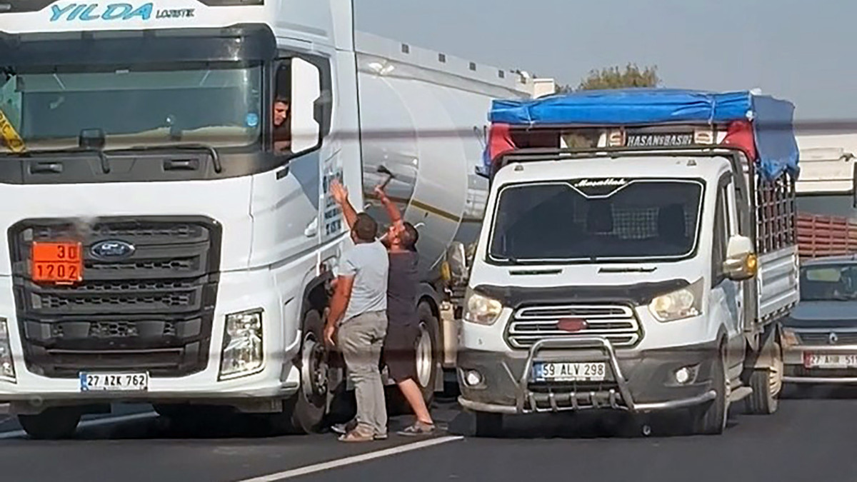 Kamyonetteki yolcu konumundaki kişi, elindeki baltayı sallayıp, TIR sürücüsüne tehditler savurdu. Bu sırada otoyolda metrelerce kuyruk oluştu.