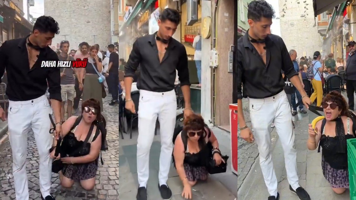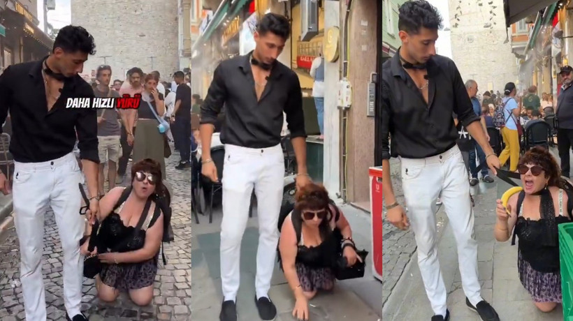 İstanbul Beyoğlu Büyükhendek Caddesi'nde bir şahıs tasma taktığı kadını sokakta dizlerinin üzerinde yürüttü.