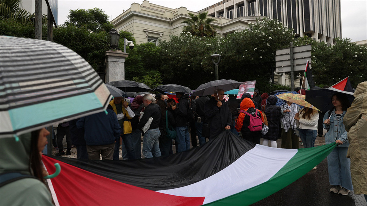 Yunanistan’ın başkenti Atina’da toplanan eylemciler, İsrail’in Küresel Sumud Filosu’na yönelik saldırısını protesto etti. Dışişleri Bakanlığı binası önünde düzenlenen eylemde “Filistin’e özgürlük” sloganları yankılandı.