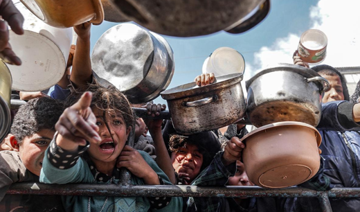 Gazze'nin güneyindeki Han Yunus şehrinin Mevasi bölgesinde yerlerinden edilen Filistinliler, boş kaplarıyla "Saade" adlı aşevinin önünde kuyruklar oluşturarak öğün almaya çalışıyor.