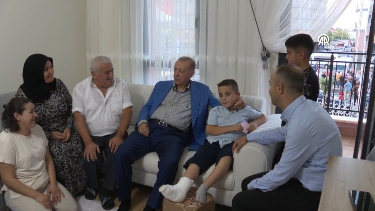 Zengin ailesinin fertleriyle bir süre sohbet eden Erdoğan, evdeki çocuklara harçlık verdi. Balkona çıkarak kendisini bekleyen vatandaşlara el sallayan Erdoğan, ardından evin önünde toplanan kalabalığın yanına giderek sohbet etti, hatıra fotoğrafı çektirdi.