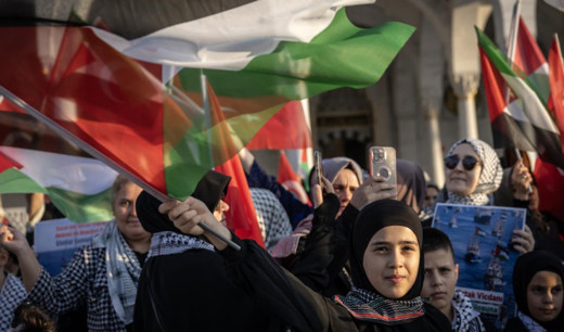 Türk ve Filistin bayrakları asılan teknelere, meydandan toplanan İzmir Sivil Toplum Kuruluşları Platformu üyeleri de ellerindeki Türk ve Filistin bayraklarıyla destek verdi.