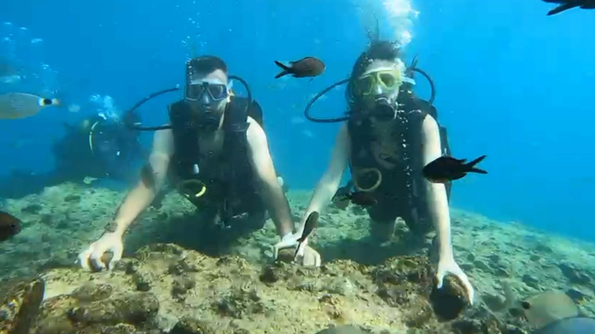 Antalya'nın Alanya ilçesinde Muhammet Akbıyık (28) uzun süre birlikte olduğu Ezgi Uysal'a (28) tüple dalış yaptıkları denizde sürpriz evlilik teklifi yaptı. Teklifine 'Evet' cevabı alan Muhammet Akbıyık, deniz altında Uysal'a yüzük taktı.